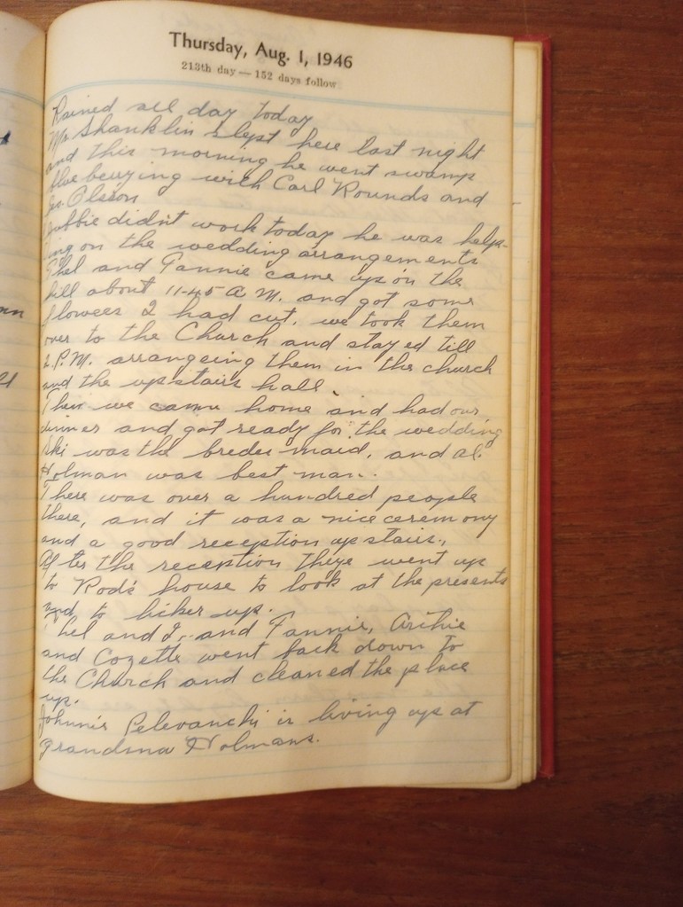 Jubbie didn’t work today. He was helping on the wedding arrangements. Thel and Fannie came up on the hill about 11:45 A.M. and got some flowers I had cut. We took them over to the church and stayed till 2 P.M. arranging them in the church and the upstairs hall. Then we came home and had our dinner and got ready for the wedding. Ski was the bride’s maid and Al. Holman was best man.