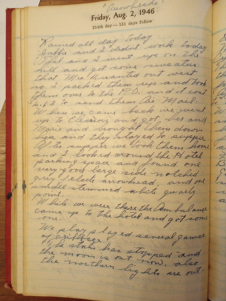 When we came back we went up to Eleanor’s and got her and Marie and brought them down here and they stayed to supper. After supper we took them home and I looked around the Hotel parking space and found one very good large side notched grey felsite arrowhead, and one small stemmed white quartz point.