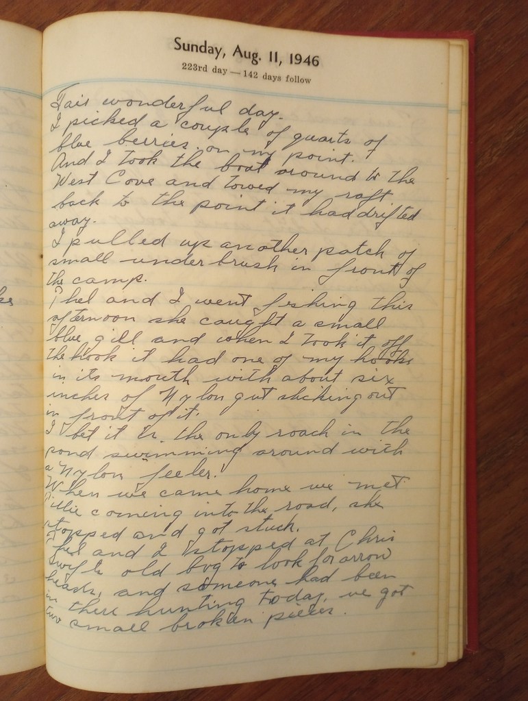 I picked a couple of quarts of blueberries on my point. And I took the boat around to the West Cove and towed my raft back to the point. It had drifted away.