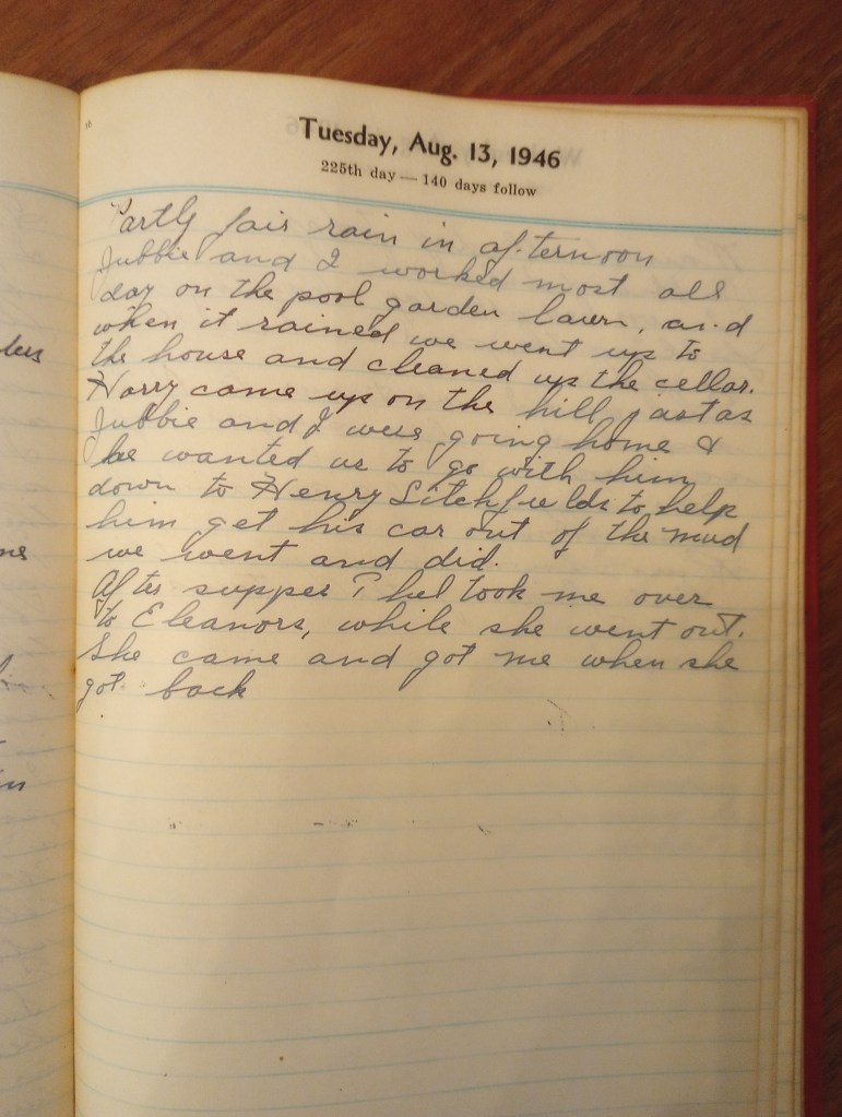 Harry came up on the hill just as Jubbie and I were going home and wanted us to go with him down to Henry Litchfield’s to help him get his car out of the mud. We went and did.