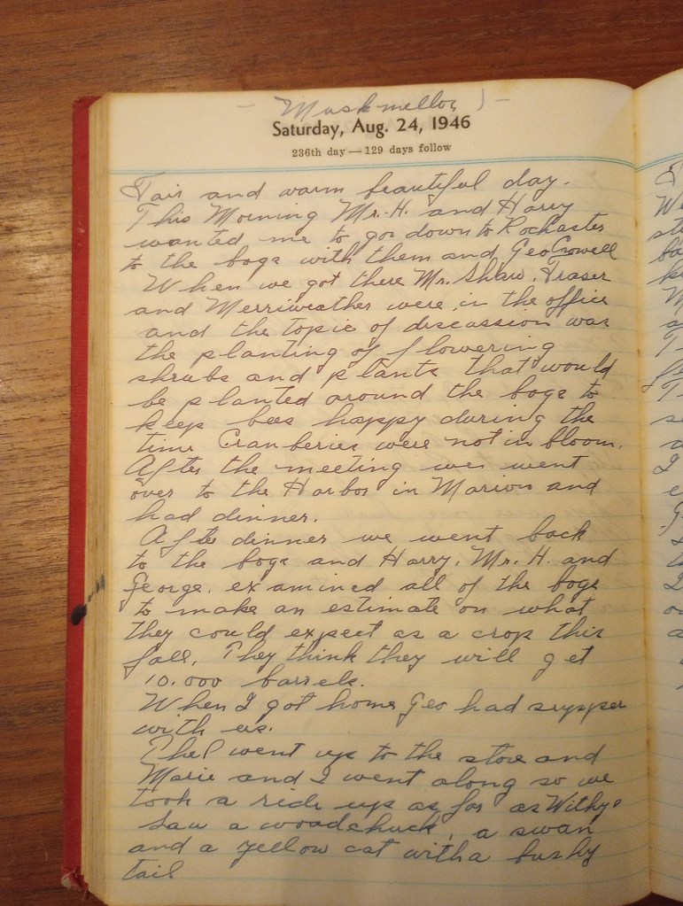 After dinner we went back to the bogs and Harry, Mr. H. and George examined all of the bogs to make an estimate on what they could expect as a crop this fall. They think they will get 10,000 barrels.