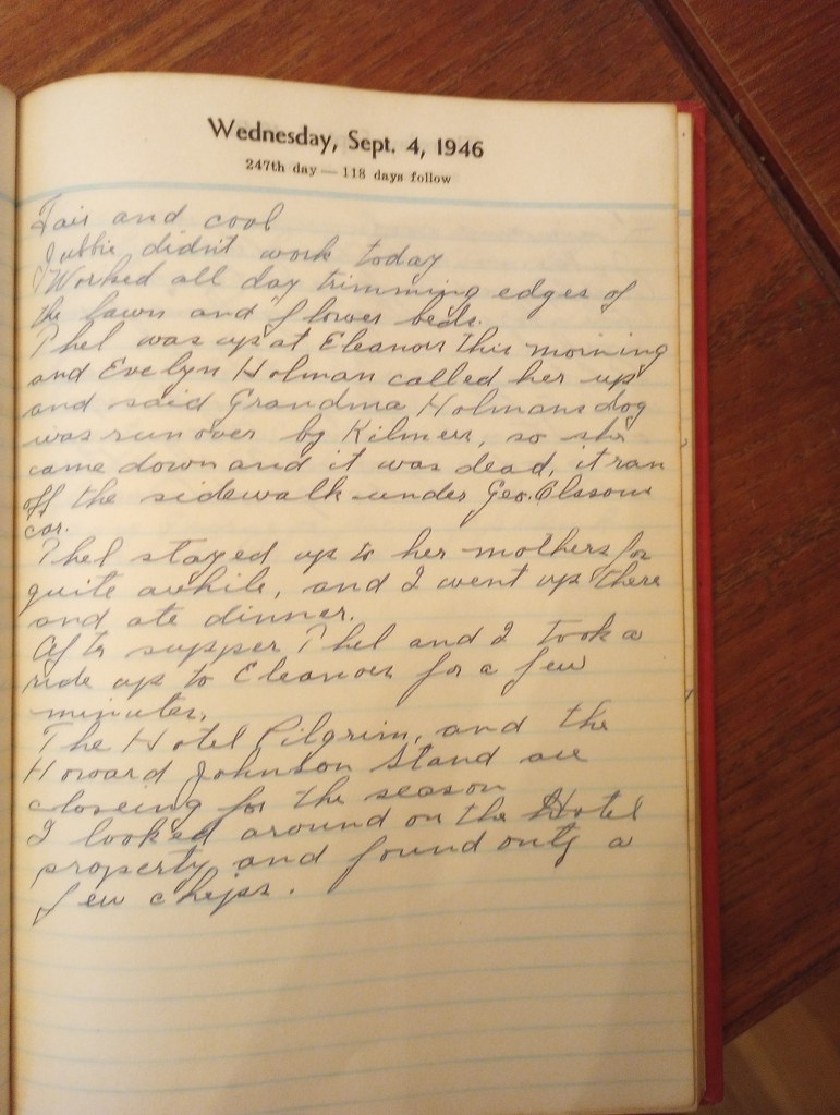 Thel was up at Eleanor’s this morning and Evenly Holman called her up and said Grandma Holman’s dog was run over by Kilmers, so she came down and it was dead. It ran off the sidewalk under Geo. Olsson’s car.