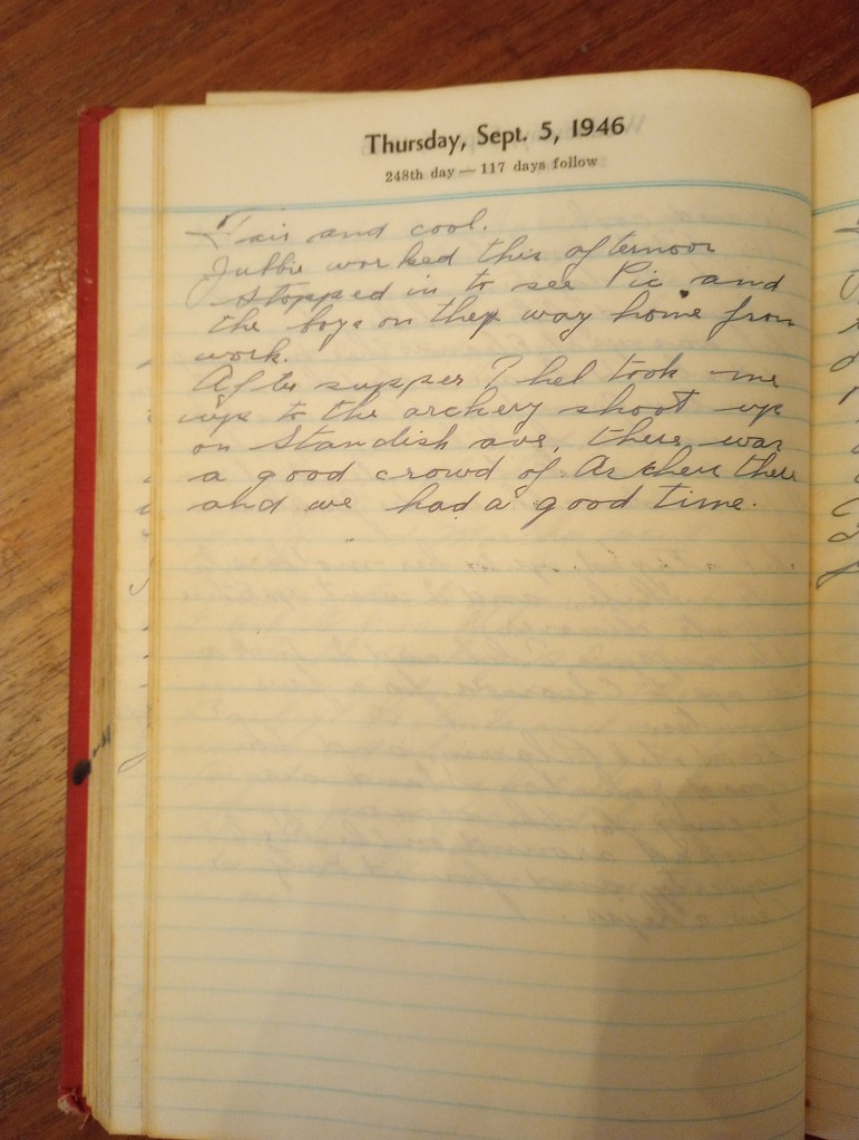 After supper Thel took me up to the archery shoot up onStandish Ave. There was a good crowd of archers there and we had a good time.
