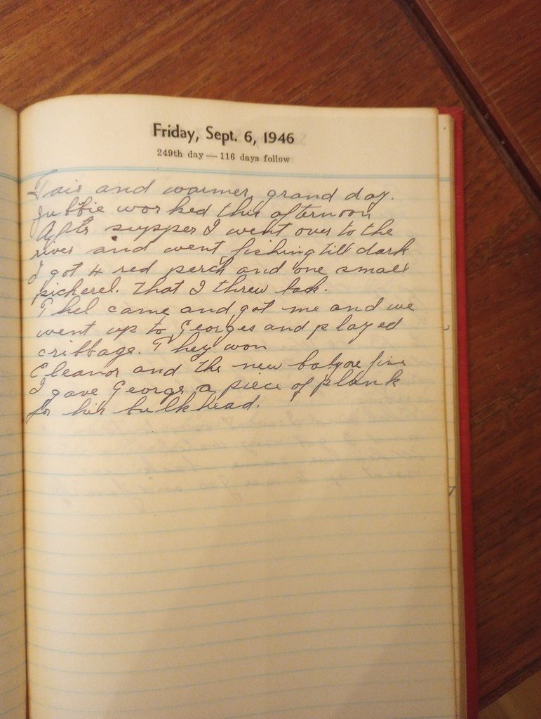 After supper I went over to the river and went fishing till dark. I got 4 red perch and one small pickerel that I threw back.