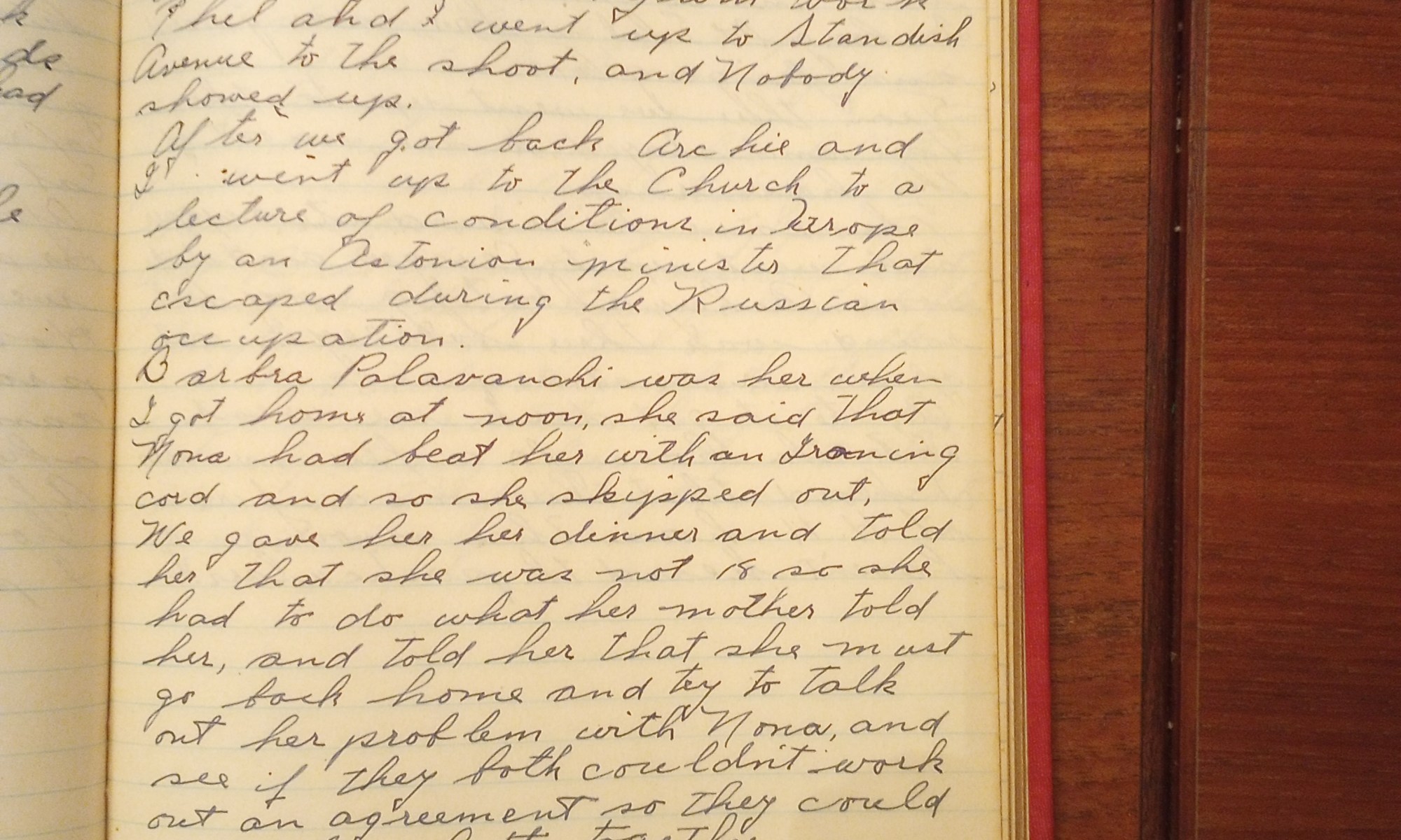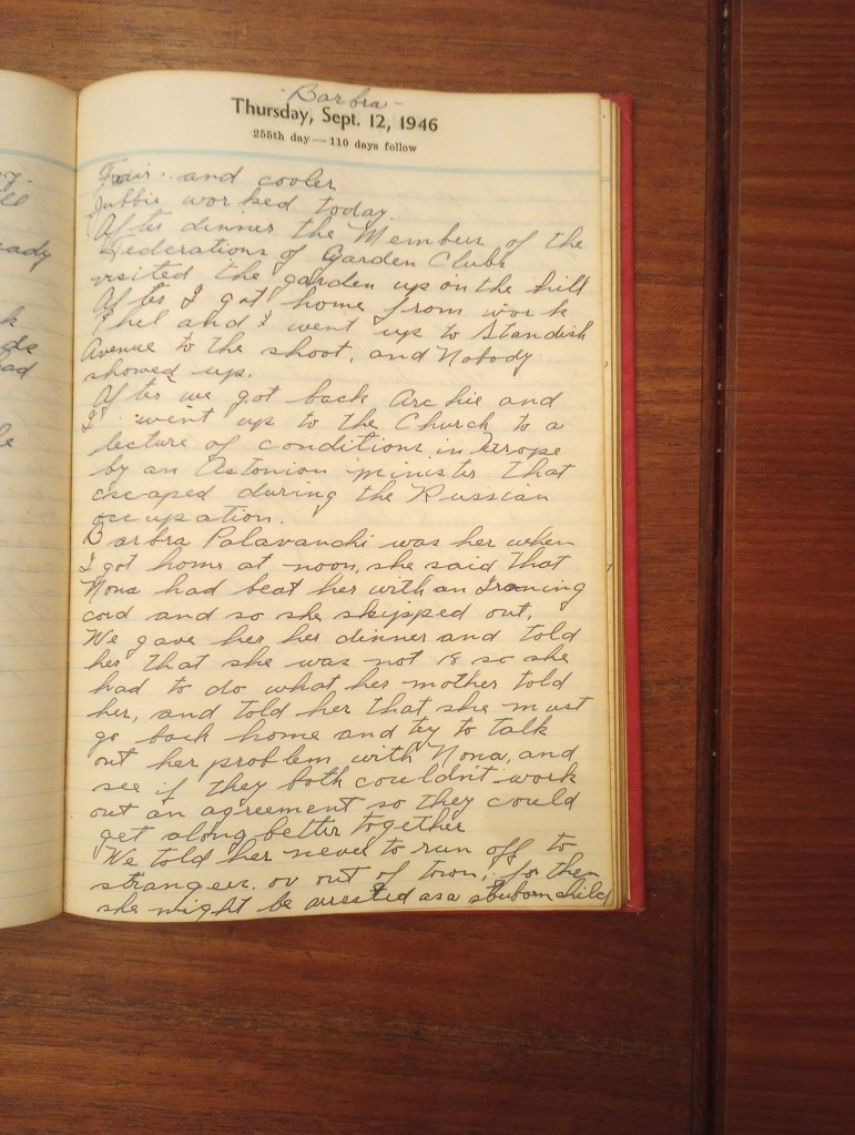 Barbara Palavanchi was here when I got home at noon. She said that Nona had beat her with an ironing cord and so she skipped out. We gave her her dinner and told her that she was not 18 so she had to do what her mother told her, and told her that she must go back home and try to talk out her problem with Nona, and see if they both couldn’t work out an agreement so they could get along better together. We told her never to run off to strangers or out of town, for then she might be arrested as a stubborn child.