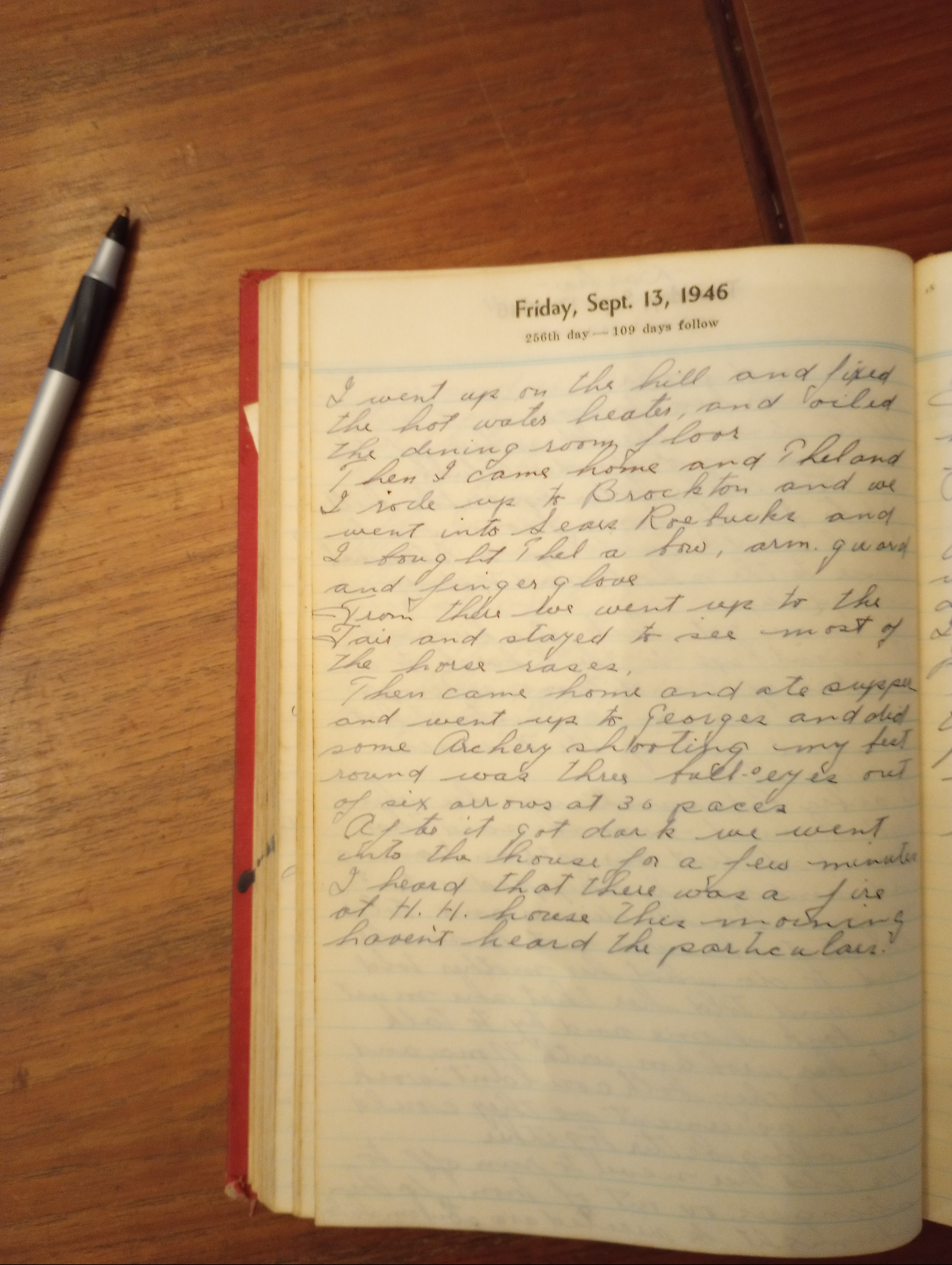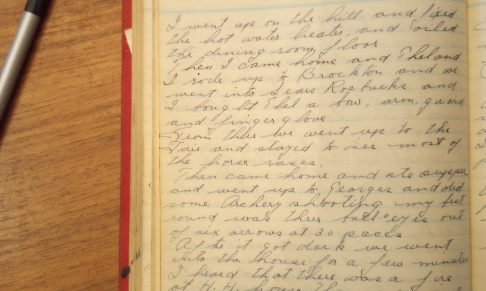 Then I came home and Thel and I rode up to Brockton and we went into Sears Roebucks and I bought Thel a bow, arm guard, and finger glove.