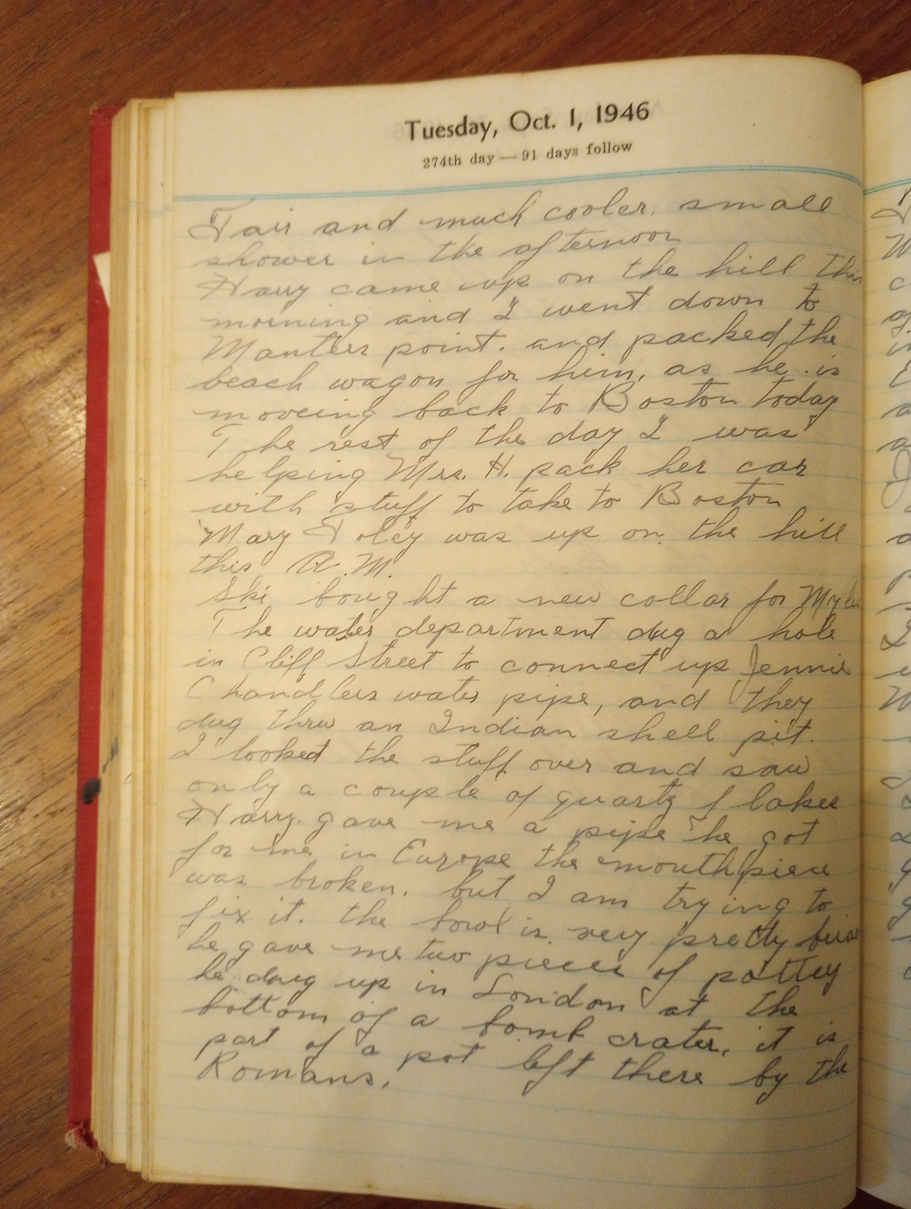 Harry came up on the hill this morning and I went down to Manter’s point and packed the beach wagon for him, as he is moving back to Boston today. The rest of the day I was helping Mrs. H. pack her car with stuff to take to Boston.