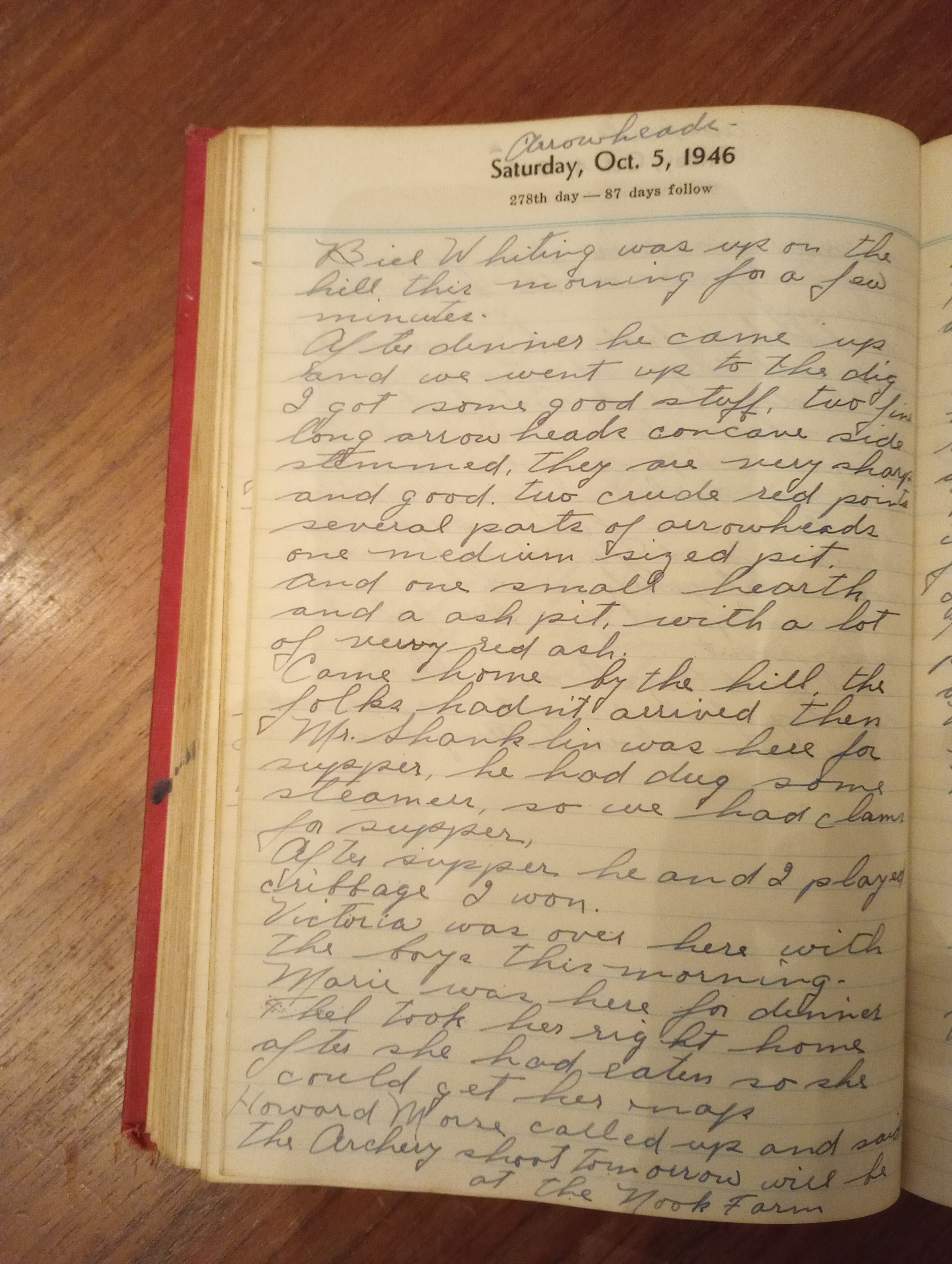 After dinner he came up and we went up to the dig. I got some good stuff, two fine long arrowheads concave side stemmed. They are very sharp and good. Two crude red points, several parts of arrowheads, one medium sized pit, and one small hearth and an ash pit, with a lot of very red ash.