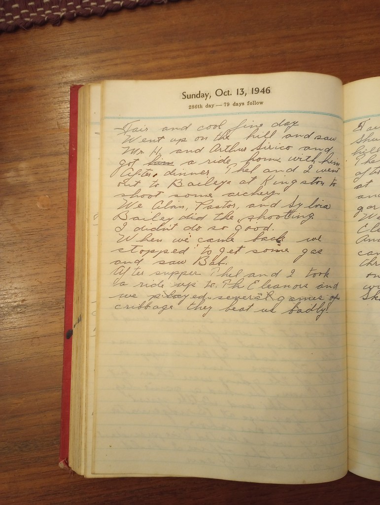 After supper Thel and I took a ride up to Eleanor’s and we played several games of cribbage. They beat us badly.