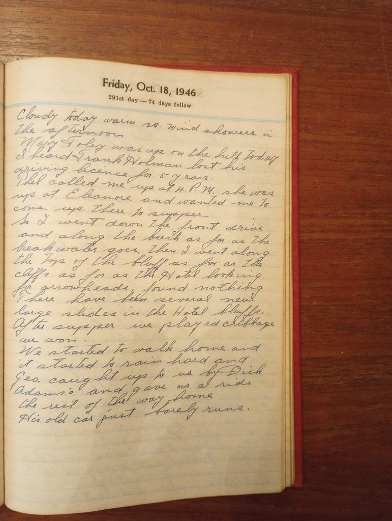 So I went down the front drive and along the beach as far as the breakwater goes, then I went along the top of the bluff as far as the cliffs, as far as the Hotel looking for arrowheads, found nothing. There have been several new large slides in the Hotel bluffs.