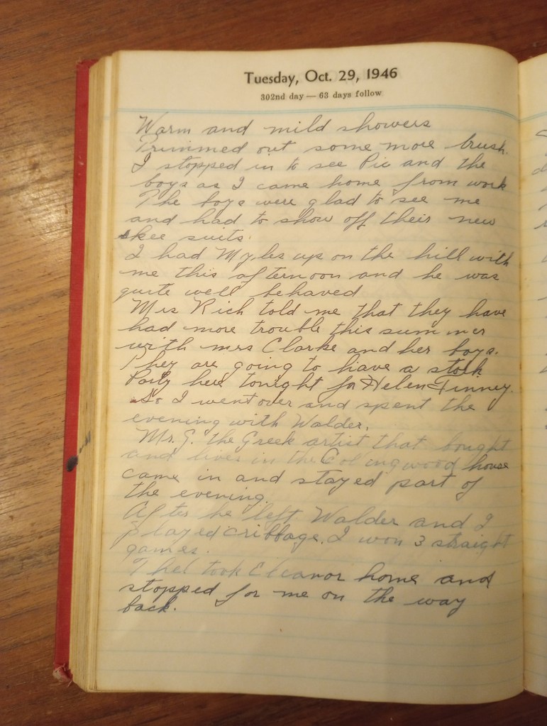Mr. G. the Greek artist that bought and lives in the Collingwood house came in and stayed part of the evening. After he left Walder and I played cribbage. I won 3 straight games.
