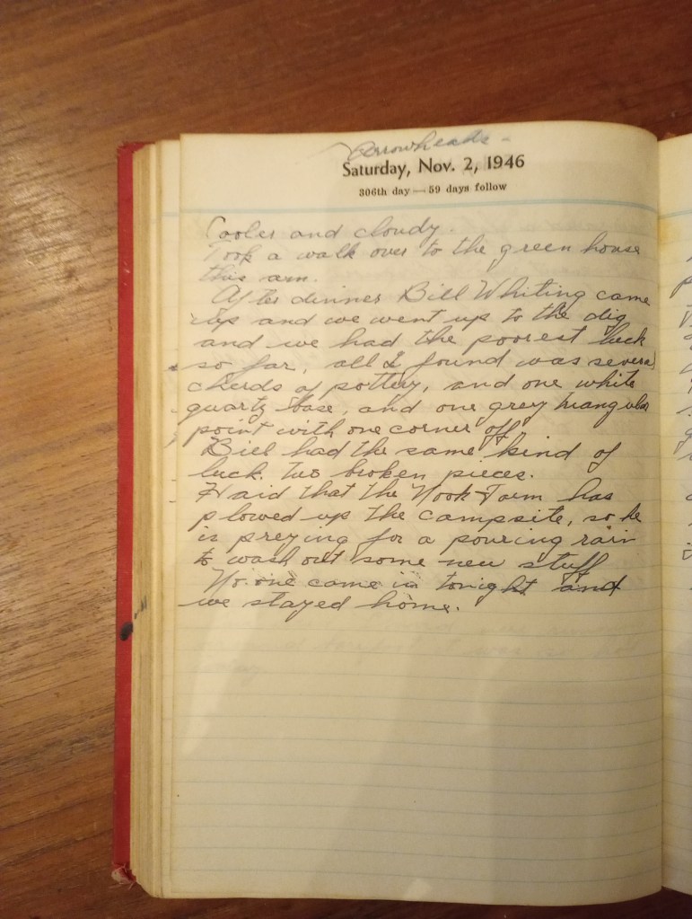After dinner Bill Whiting came up and we went up to the dig and we had the poorest luck so far. All I found was several chards of pottery, and one white quartz base, and one grey triangular point with one corner off.