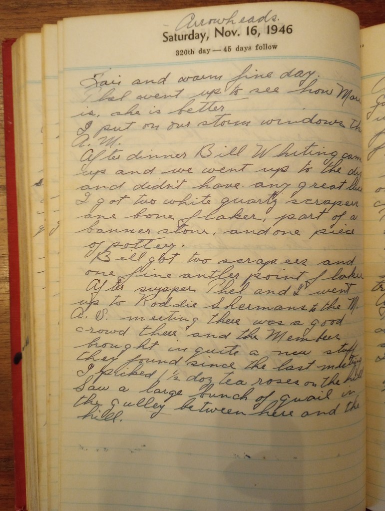 After supper Thel and I went up to Roddie Sherman’s to the M.A.S. meeting. There was a good crowd there and the members brought in quite a (lot of) new stuff they found since the last meeting.