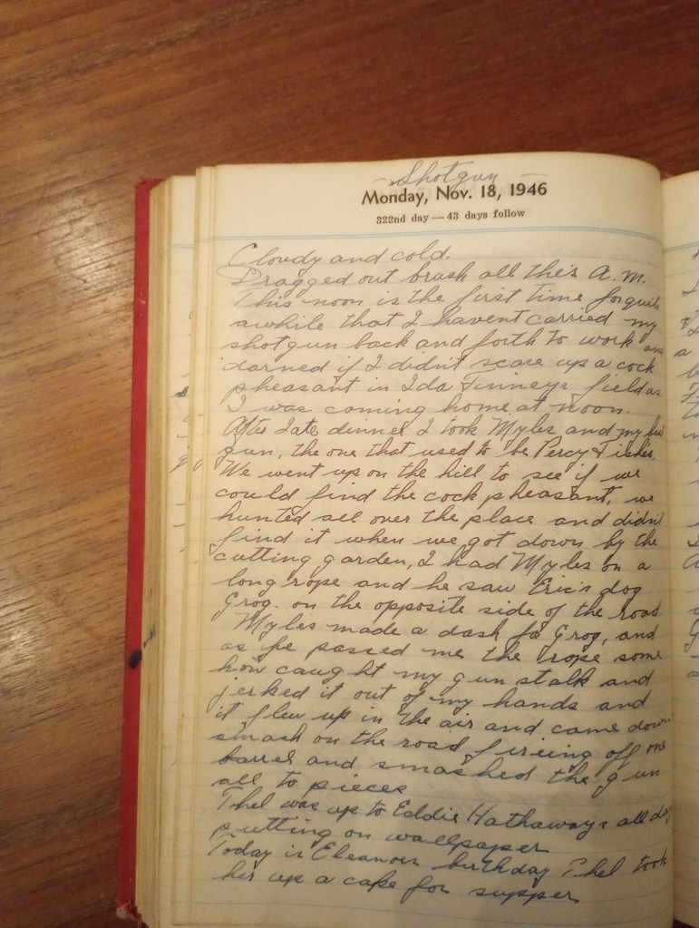 After I ate dinner I took Myles and my best gun, the one that used to be Percy Fiske’s. We went up on the hill to see if we could find the cock pheasant. We hunted all over the place and didn’t find it. When we got down by the cutting garden, I had Myles on a long rope and he saw Eric’s dog, Grog, on the opposite side of the road. Myles made a dash for Grog, and as he passed me the rope somehow caught my gun stalk and jerked it out of my hands and it flew up in the air and came down smash on the road firing off one barrel and smashed the gun all to pieces.