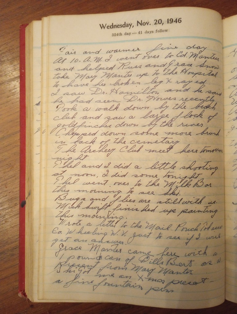At 10 A.M. I went to Ed Manter’s and helped Russ and Grace Snow take Mary Manter to the hospital to have her broken leg x-rayed.  I saw Dr. Hamilton and he said he had seen Dr. Howes recently.