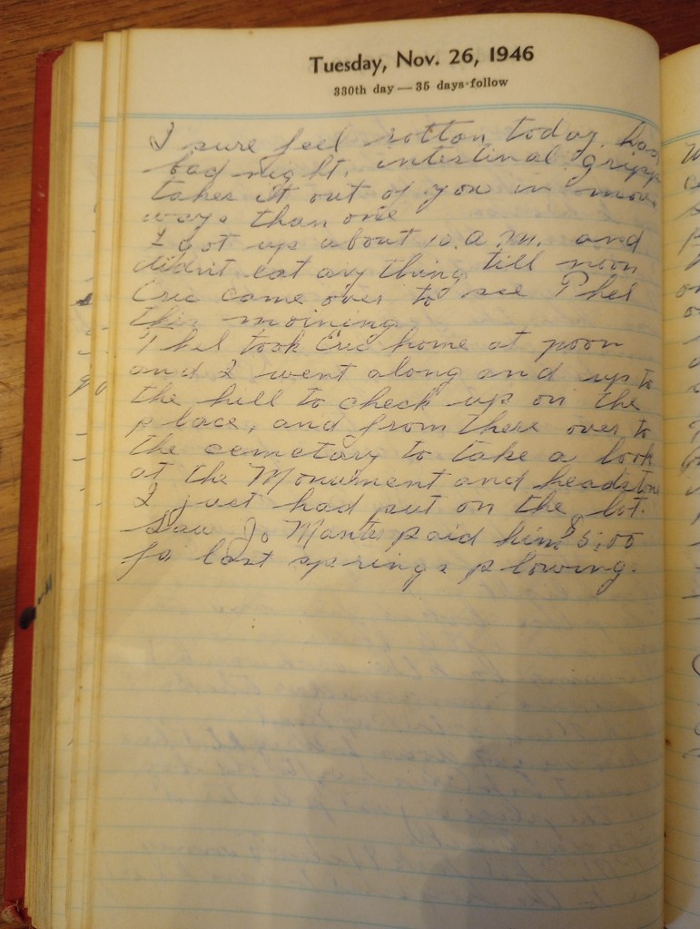 Thel took Eric home at noon and I went along and up to the hill to check up on the place, and from there over to the cemetery to take a look at the monument and headstone I just had put on the lot.