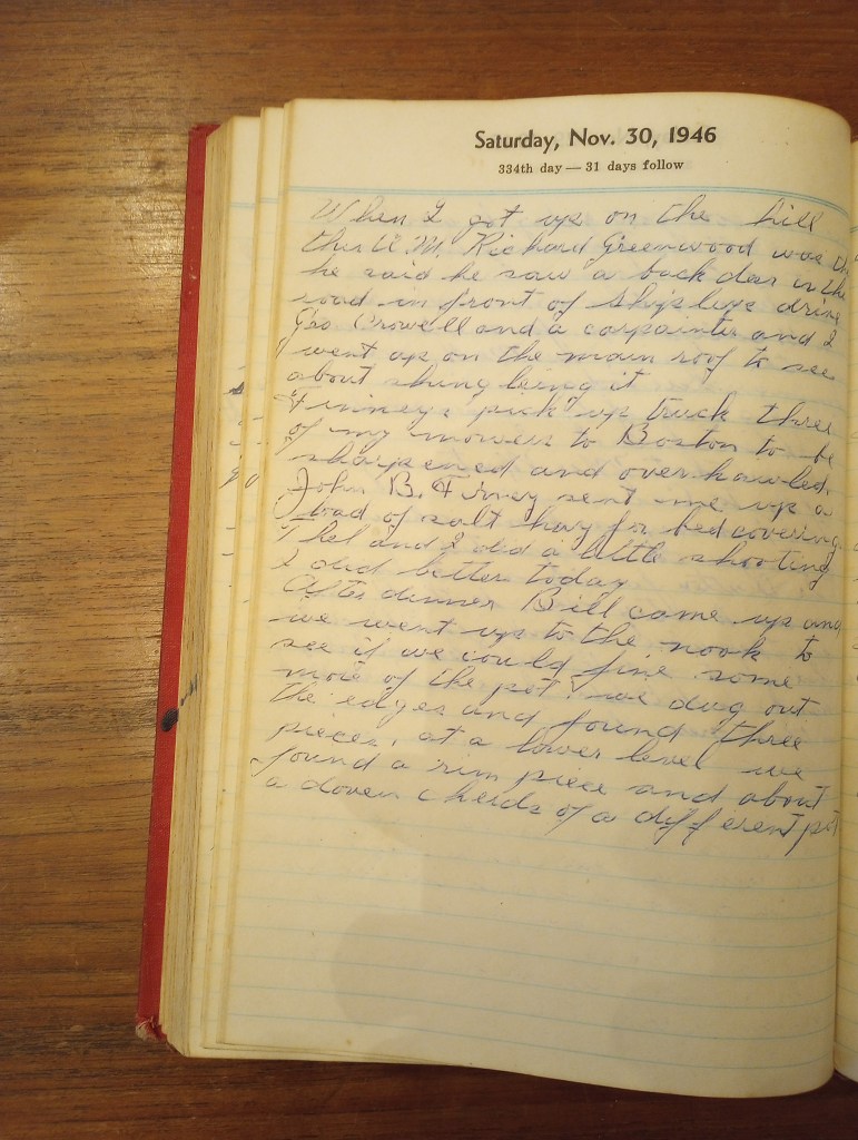 When I got up on the hill this A.M. Richard Greenwood was there. He said he saw a buck deer in the road in front of Shipley’s drive. Geo. Crowell and a carpenter and I went up on the main roof to see about shingling it.