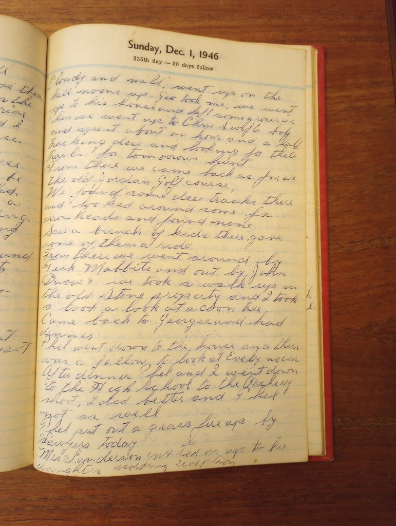 Cloudy and mild, went up on the hill, no one up. Geo. took me, we went up to his house and left some groceries. Then we went up to Chris Swift’s bog and spent about an hour and a half tracking deer and looking for their tracks for tomorrow’s hunt. From there we came back as far as the old Jordan golf course.