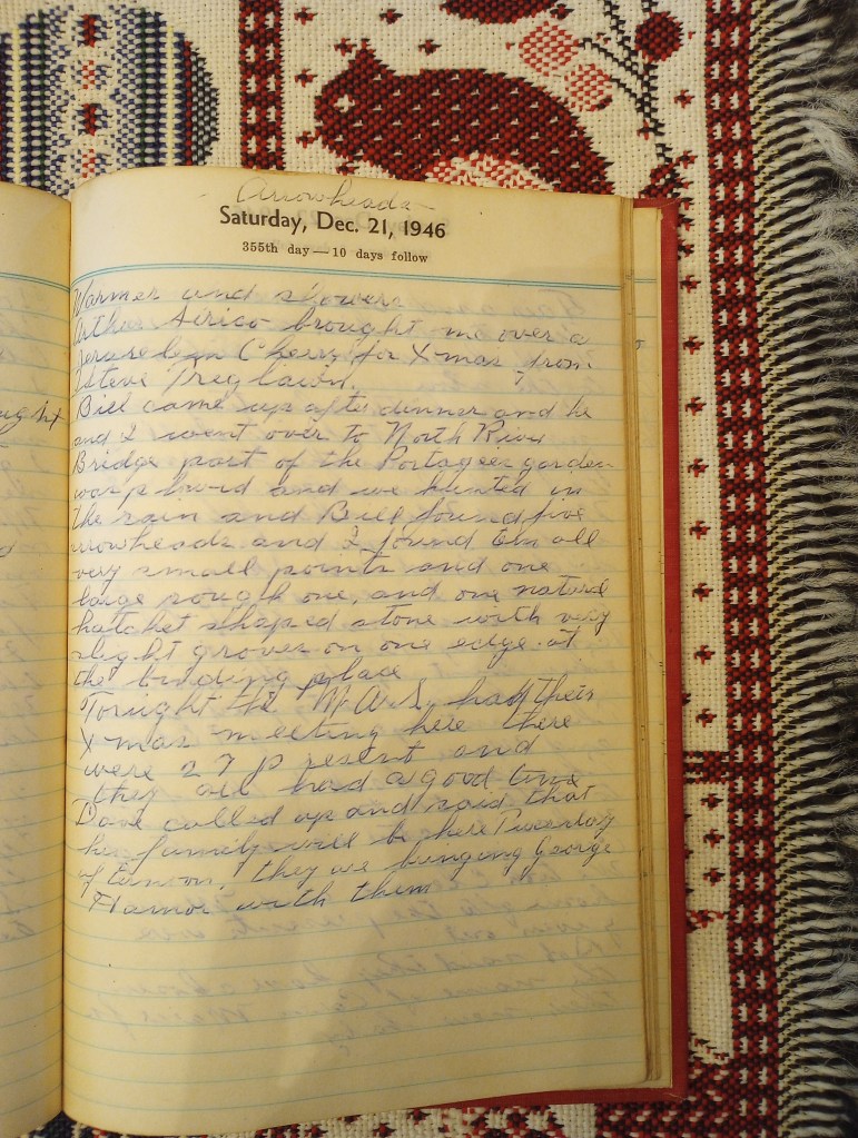 Bill came up after dinner and he and I went over to North River Bridge. Part of the Portuguese garden was plowed and we hunted in the rain and Bill found five arrowheads and I found ten all very small points and one large rough one, and one natural hatchet shaped stone with very slight grooves on one edge at the binding place.