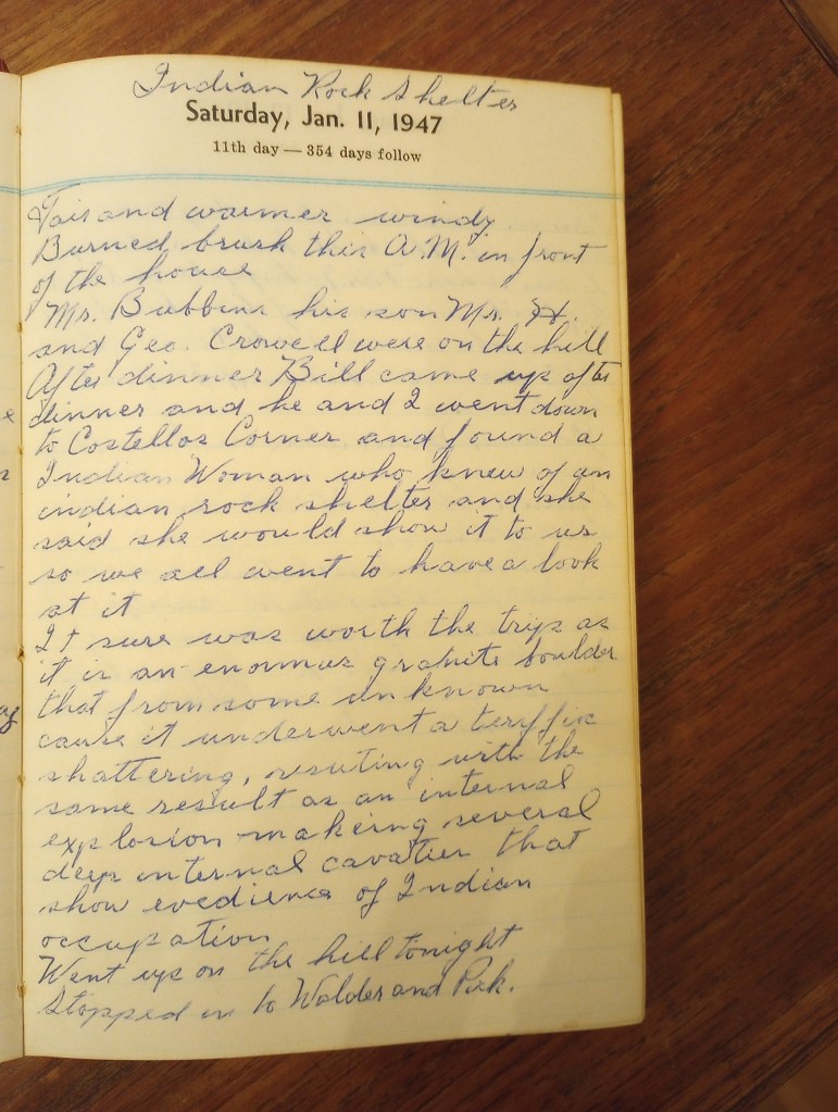 After dinner Bill came up and he and I went down to Costello’s corner and found an Indian woman who knew of an Indian rock shelter and she said she would show it to us and we all went to have a look at it.