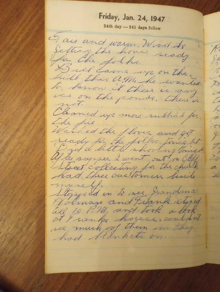 Stopped in to see Grandma Holman and Frank, stayed till 10 P.M. and took a look at Frank’s horses, couldn’t see much of them as they had blankets on.