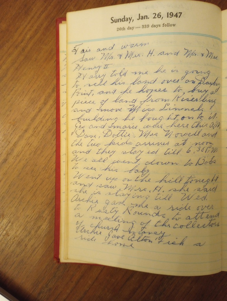 Geo. and Marie were here this A.M. Dave, Dottie, Mrs. Nowell, and the two kids arrived at noon and they stayed until 6:30 P.M. We all went down to Bob’ s to see his baby.