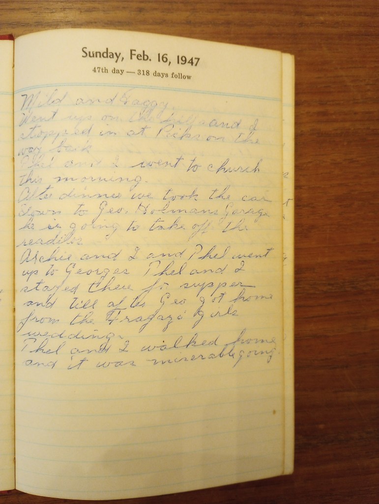 Archie and I and Thel went up to George’s. Thel and I stayed there for supper and till after Geo. got home from the Fugazzi’s girl’s wedding.