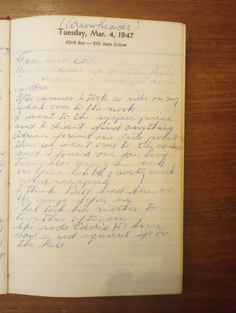 I went to the upper piece and I didn’t find anything. Adrian found one fine point. Then we went over to the camp and I found one fair long triangular grey green and one fine white quartz snub nosed scraper.