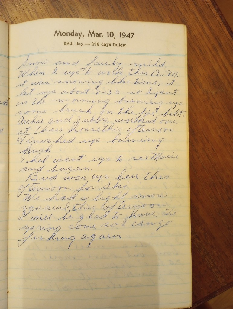 When I (was) up to work this A.M. it was snowing like time. It let up about 8:30 so I put in the morning burning up some brush on the fire belt.