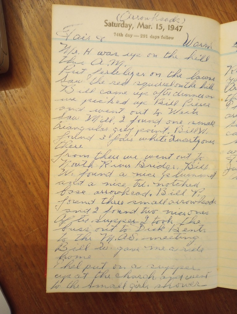 Bill came up after dinner and we picked up Bill Pierce and went out to West’s Saw Mill. I found one small triangular grey point. Bill W. found 3 fair white quartz ones there.