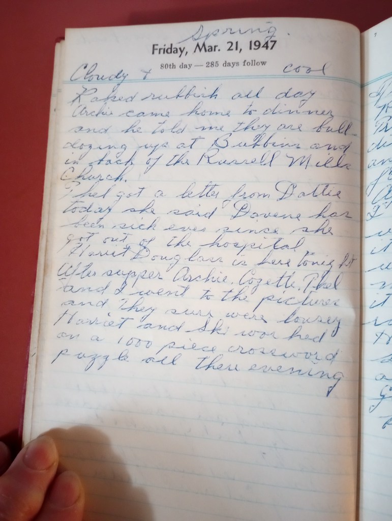 Archie came home to dinner and he told me they are bulldozing up at Bubbins’s and in back on the Russell Mills Church.