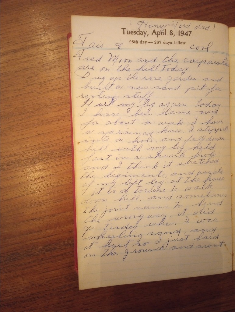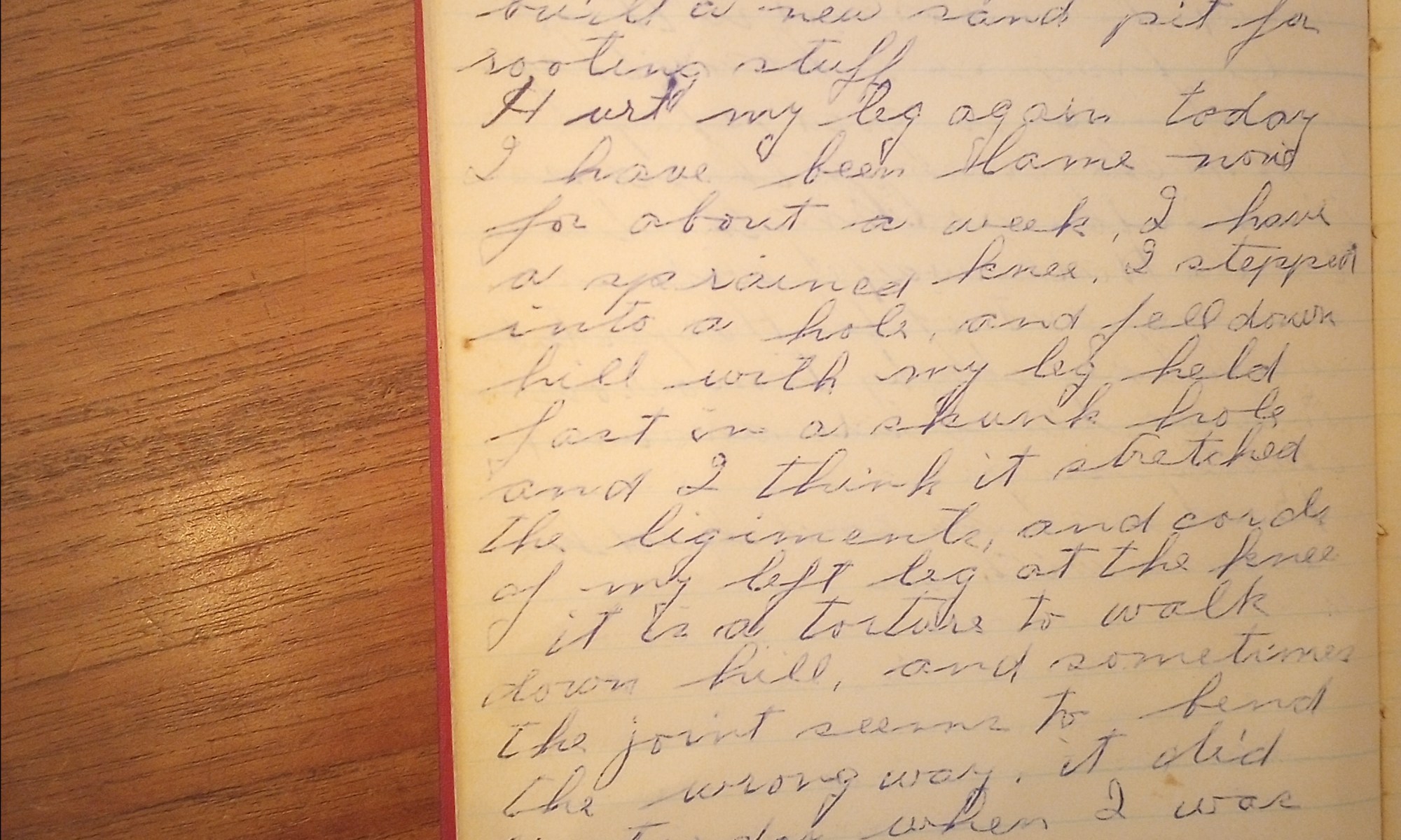 Hurt my leg again today. I have been lame now for about a week. I have a sprained knee. I stepped into a hole and fell down hill with my leg held fast in a skunk hole and I think I stretched the ligaments and cords of my left leg at the knee. It is a torture to walk down hill, and sometimes the joint seems to bend the wrong way. It did yesterday when I was wheeling sand, and it hurt so I just laid on the ground and sweat.