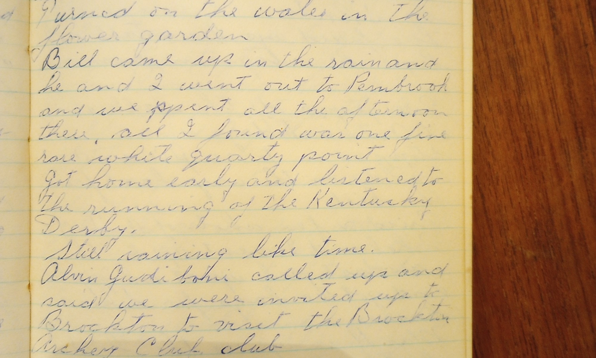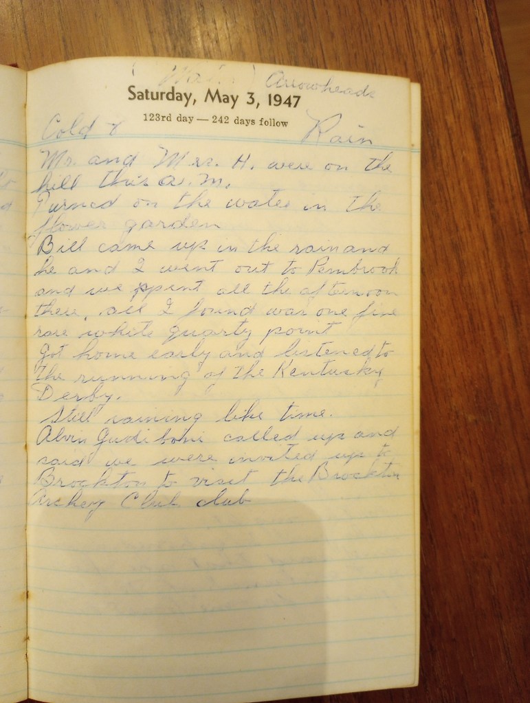 Bill came up in the rain and he and I went out to Pembroke and we spent all the afternoon there, all I found was one fine rare white quartz point.
