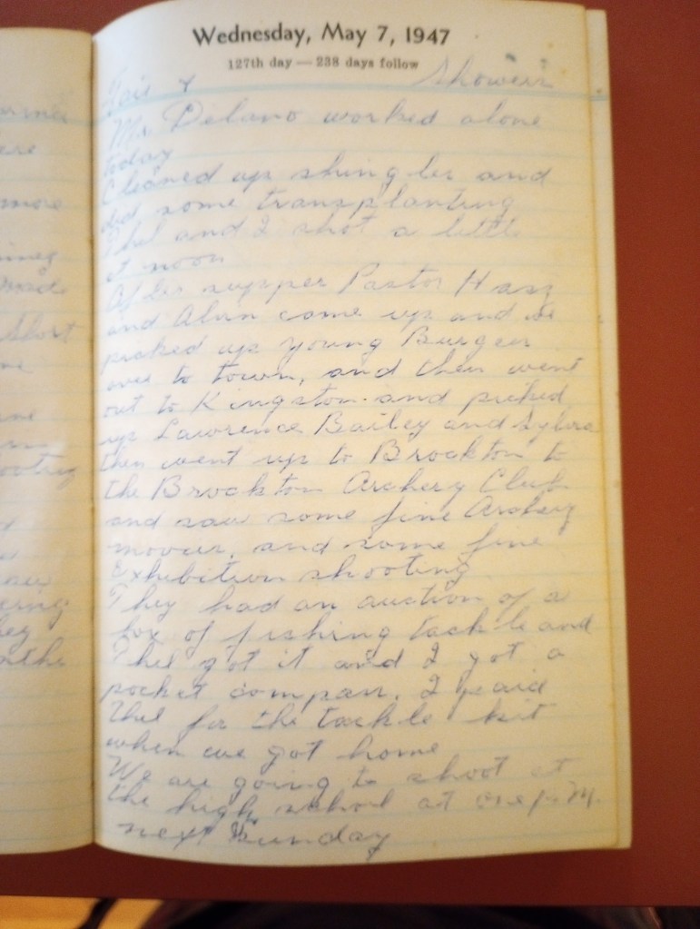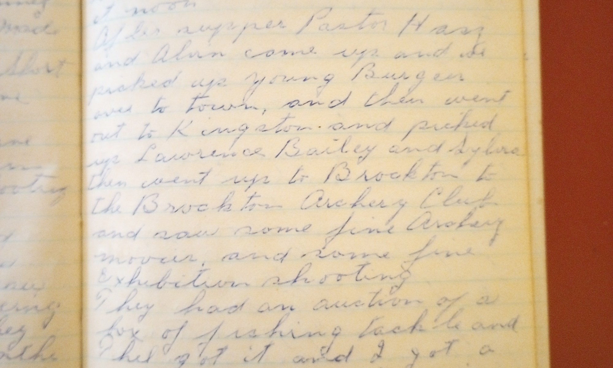 After supper Pastor Hass and Alvin came up and we picked up young Burgess over to town, and then went out to Kingston and picked up Lawrence Bailey and Sylvia, then went up to Brockton to the Brockton Archery Club and saw some fine archery movies, and some fine exhibition shooting.