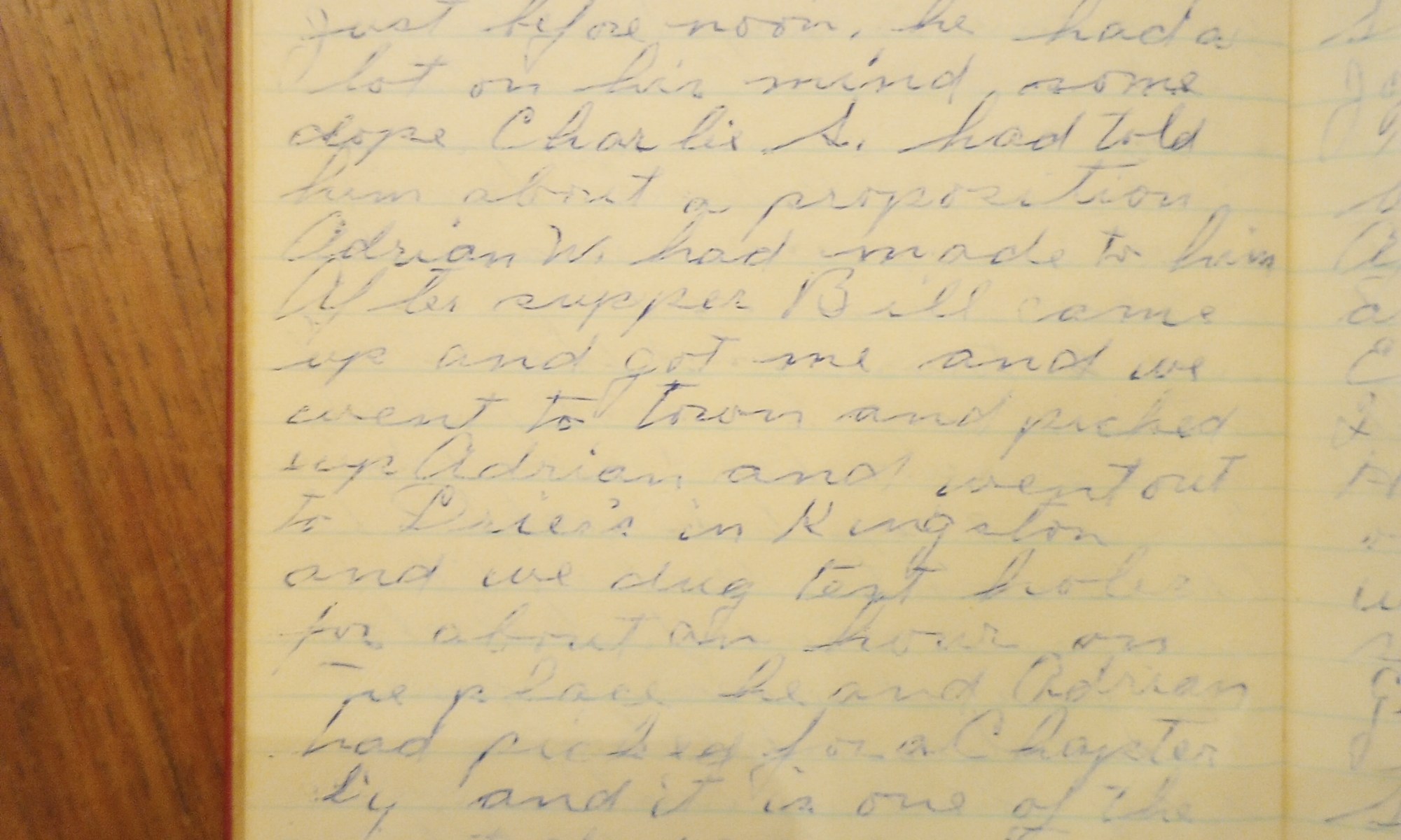 After supper Bill came up and got me and we went to town and picked up Adrian and went out to Dries’s in Kingston and we dug test holes for about an hour on the place he and Adrian had picked for a Chapter ? and it is one of the most disappointing places I ever saw, so I think we will pass that place up.