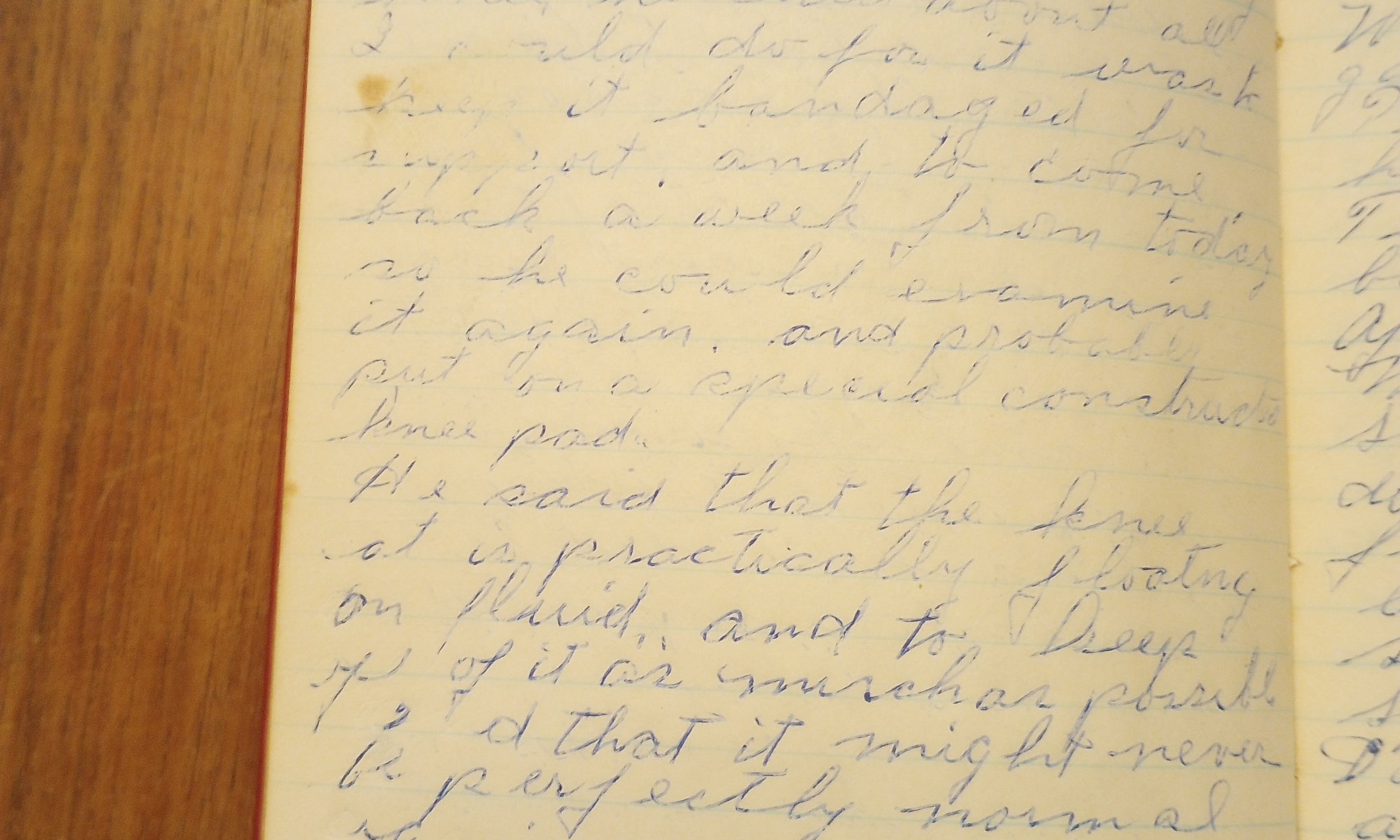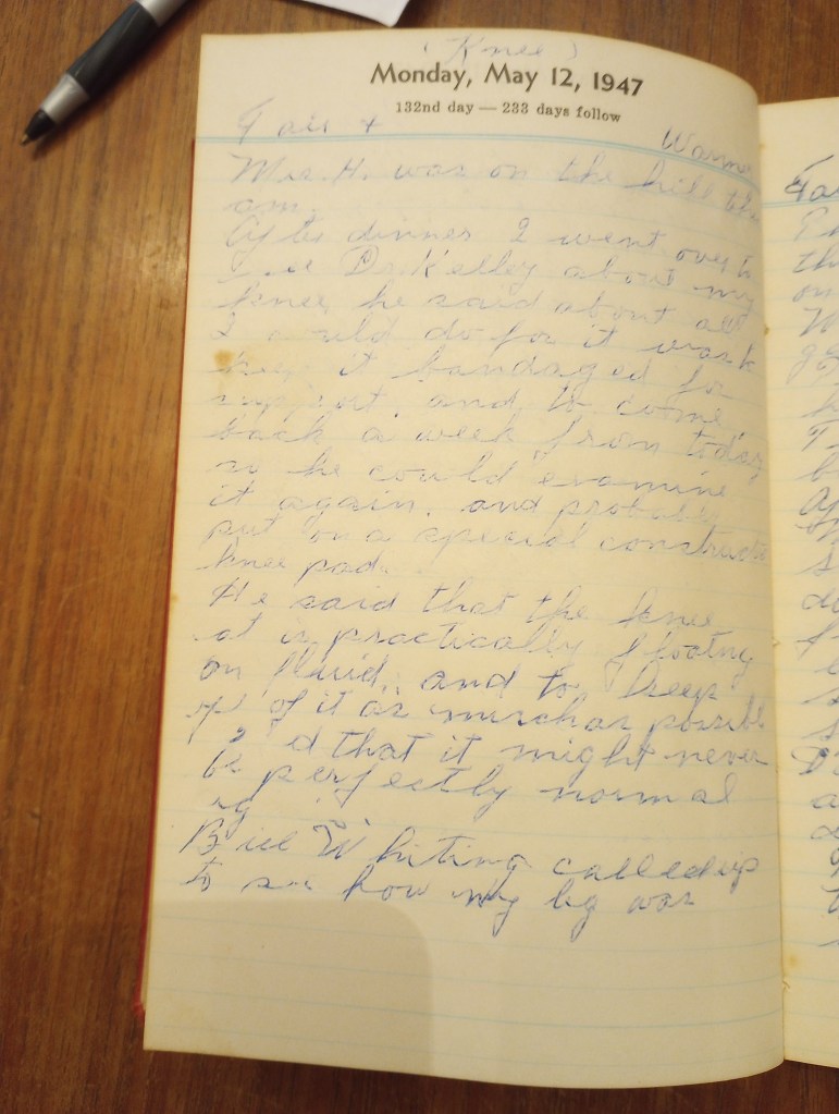 After dinner I went over to see Dr. Kelley about my knee. He said about all I could do for it was to keep it bandaged for support, and to come back a week from today so he could examine it again, and probably put on a special constructed knee pad.