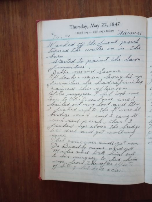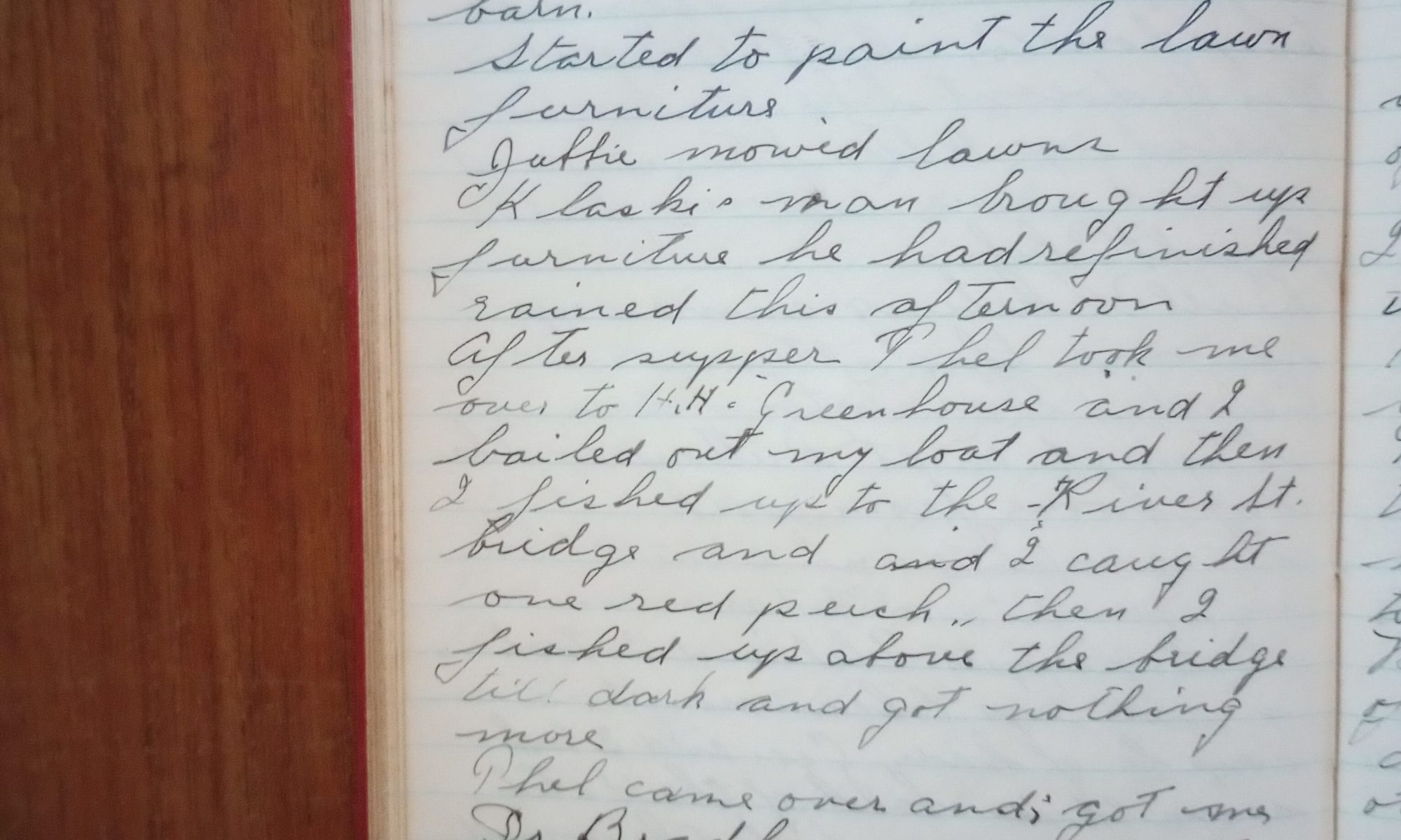 After supper Thel took me over to H.H. greenhouse and I bailed out my boat and then I fished up to the River St. bridge and I caught one red perch, then I fished up above the bridge til dark and got nothing more.