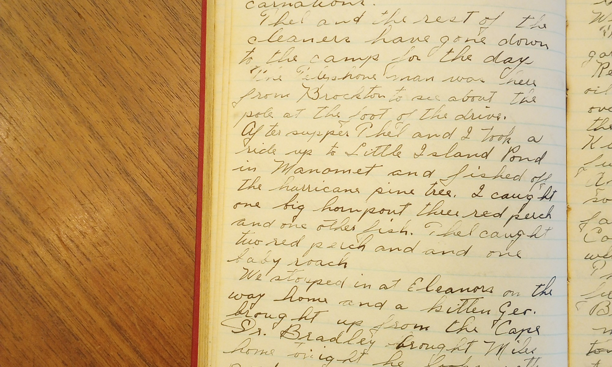 After supper Thel and I took a ride up to Little Island Pond in Manomet and fished off the hurricane pine tree. I caught one big hornpout,three red perch, and one other fish. Thel caught two red perch and one baby roach.