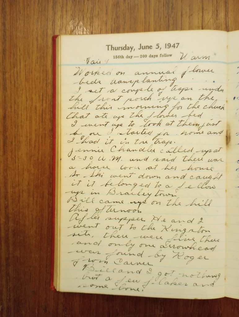 After supper he and I went out to the Kingston site. There were five there and only one arrowhead was found by Roger from Carver. Bill and I got nothing but a few flakes and some bone.