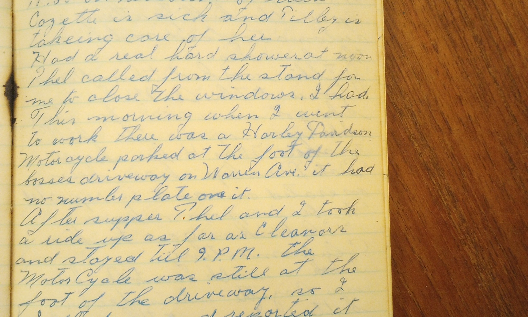After supper Thel and I took a ride up as far as Eleanor’s and stayed till 9 P.M. The motorcycle was still at the foot of the driveway, so I called up and reported it to the police.