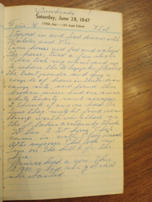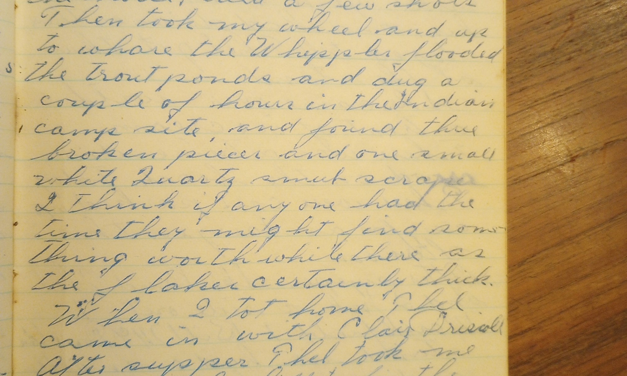 Then took my wheel and [went] up to where the Whipples flooded the trout ponds and dug a couple of hours in the Indian camp site and found three broken pieces and one small white quartz snub scraper. I think if anyone had the time they might find something worthwhile there as the flakes [are] certainly thick.