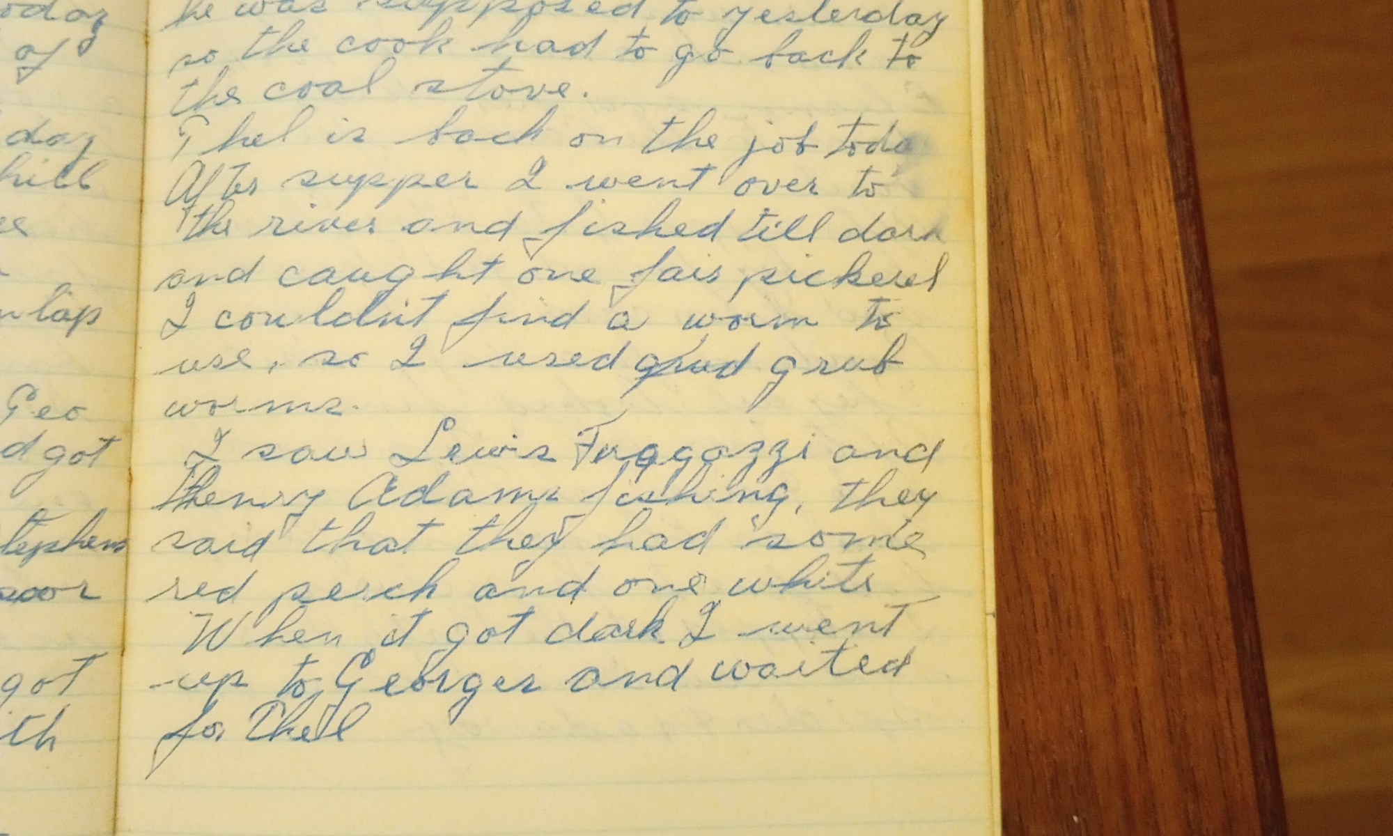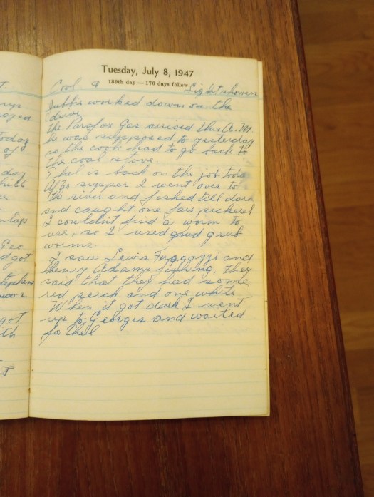 After supper I went over to the river and fished till dark and caught one fair pickerel. I couldn’t find a worm to use, so I used grub worms.