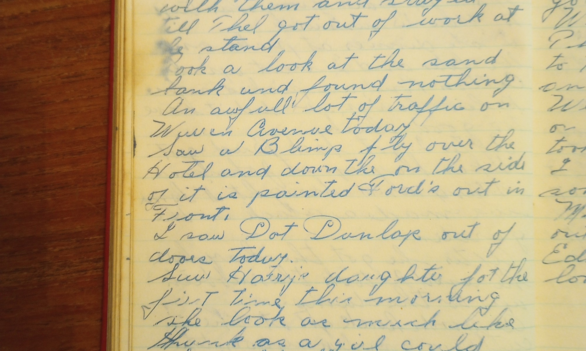 Saw a blimp fly over the Hotel and down the [hill?] On the side of it is painted Ford’s out in Front.