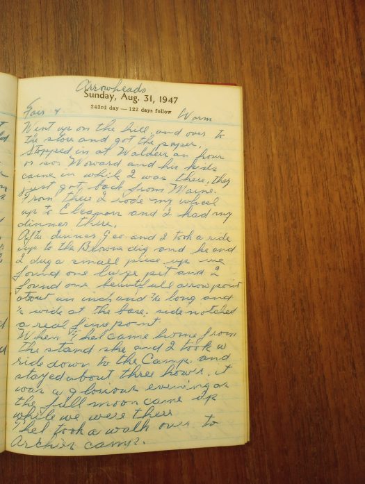 After dinner Geo and I took a ride up to the Browne dig and he and I dug a small piece up. We found one large pit and I found one beautiful arrow point about an inch and ¾ long and ½ wide at the base, side notched, a real fine point.