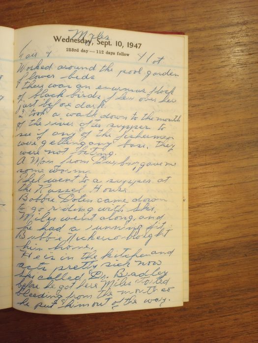 He is in the kitchen and acts pretty sick now. Ski called Dr. Bradley. Before he got here Miles started bleeding from the mouth so he put him out of the way.