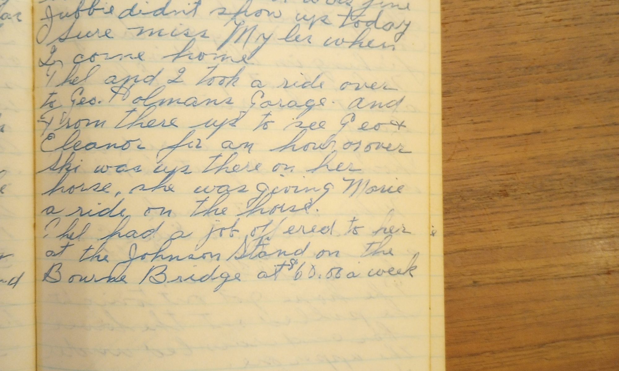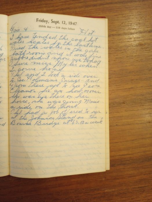 Thel and I took a ride over to Geo. Holman’s garage and from there up to see Geo. and Eleanor for an hour or so. Ski was up there on her horse. She was giving Marie a ride on the horse.