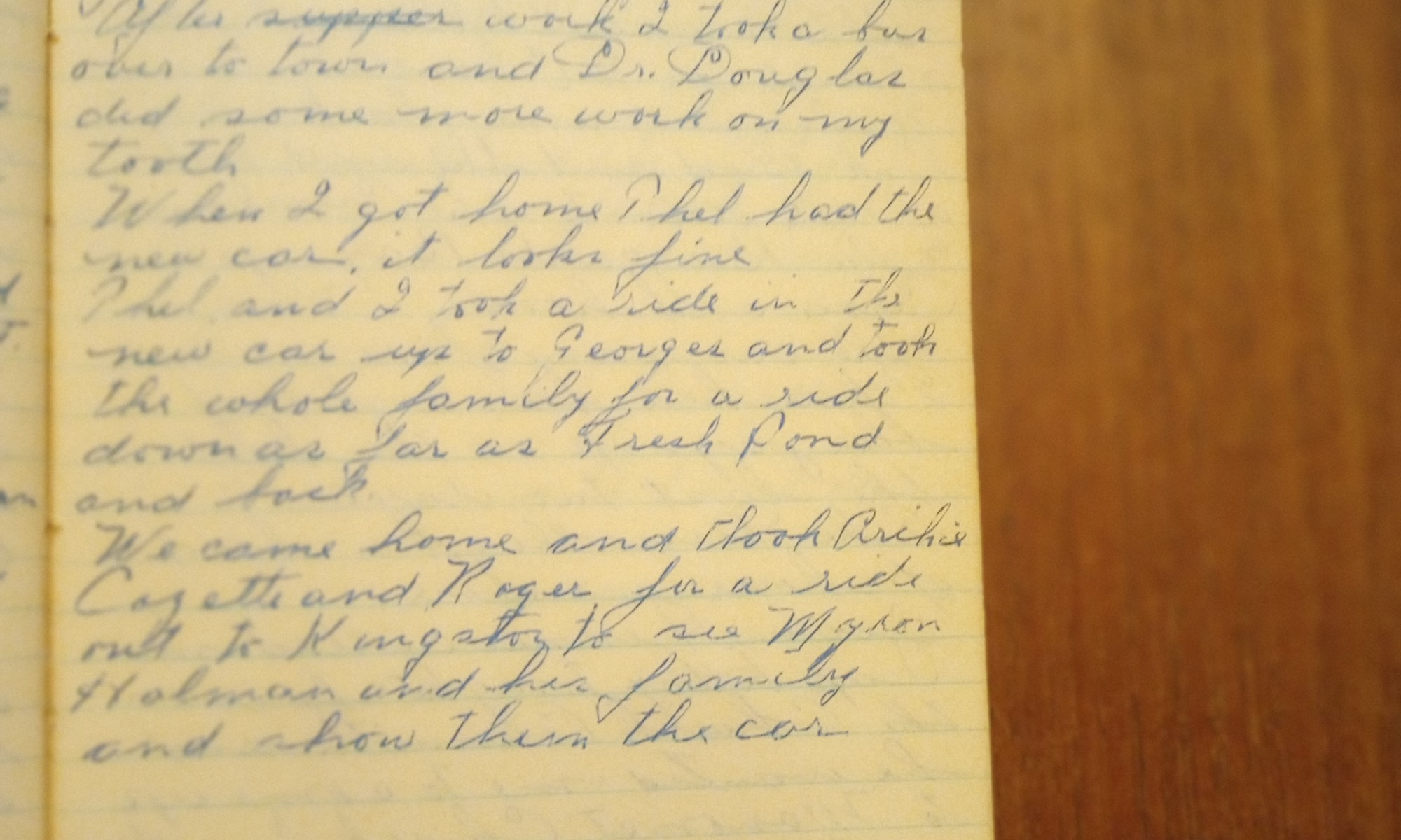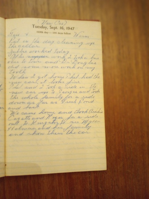 Thel and I took a ride in the new car up to George’s and took the whole family for a ride down as far as Fresh Pond and back.