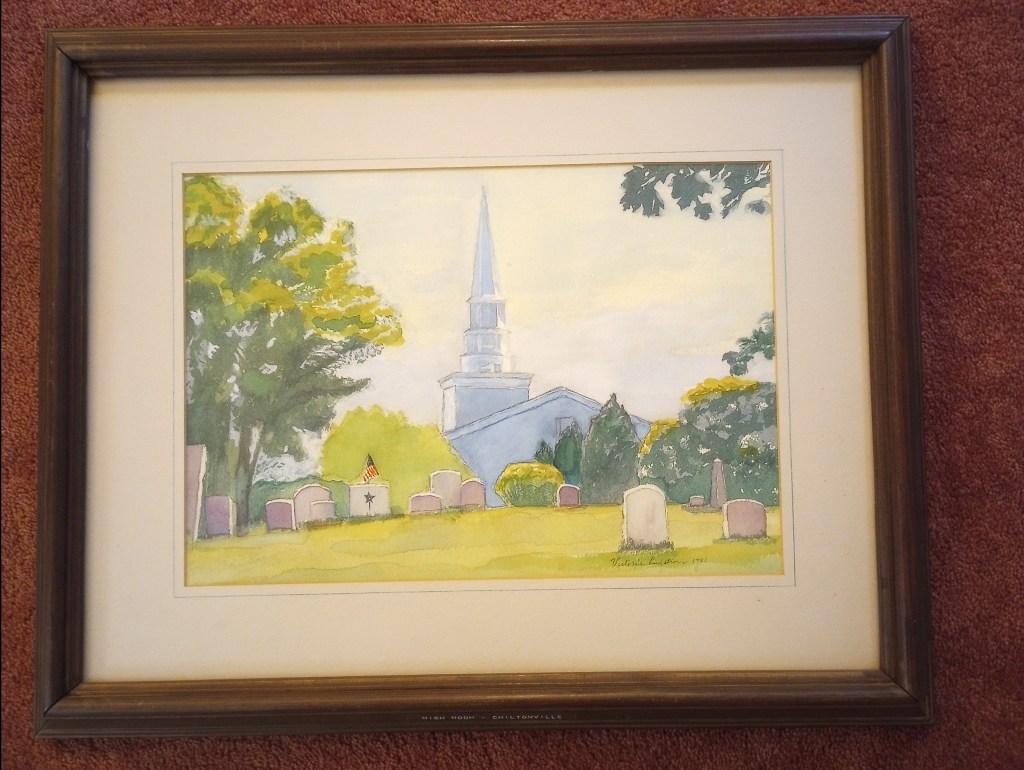 This painting is of the Chiltonville Church from the viewpoint of Chiltonville Cemetery. It’s a watercolor by Victoria Brewer Engstrom (Pick).