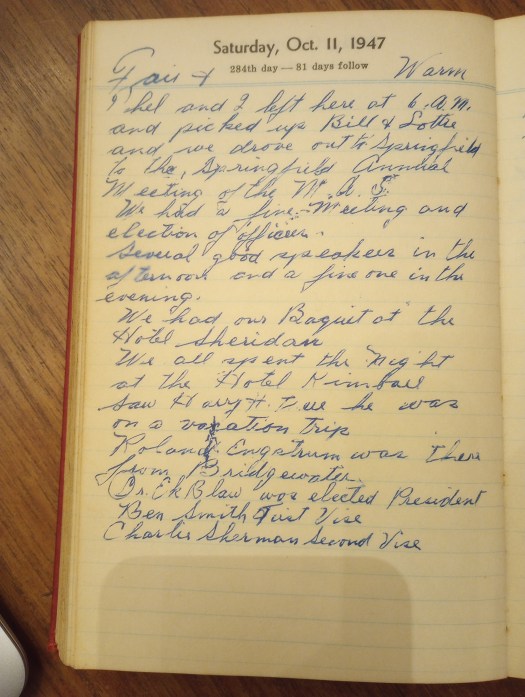 Thel and I left heere at 6 A.M. and picked up Bill + Lottie and we drove out to Springfield to the Springfield Annual Meeting of the M.A.S.
