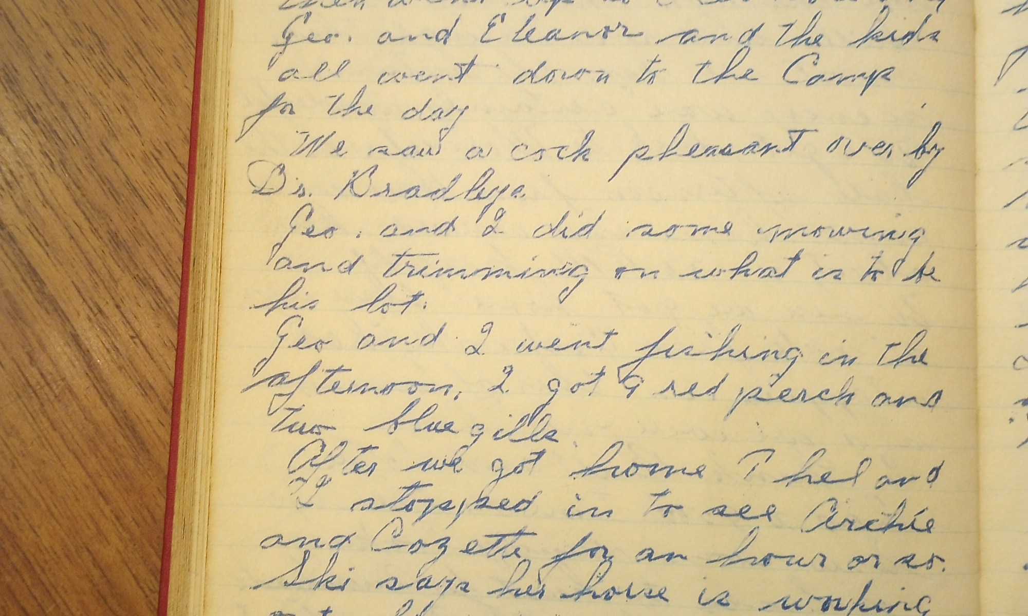 Fair and warm. Thel and I rode up around the store + picked up the paper. Then went up to Eleanor’s and Geo. and Eleanor and the kids all went down to the camp for the day.